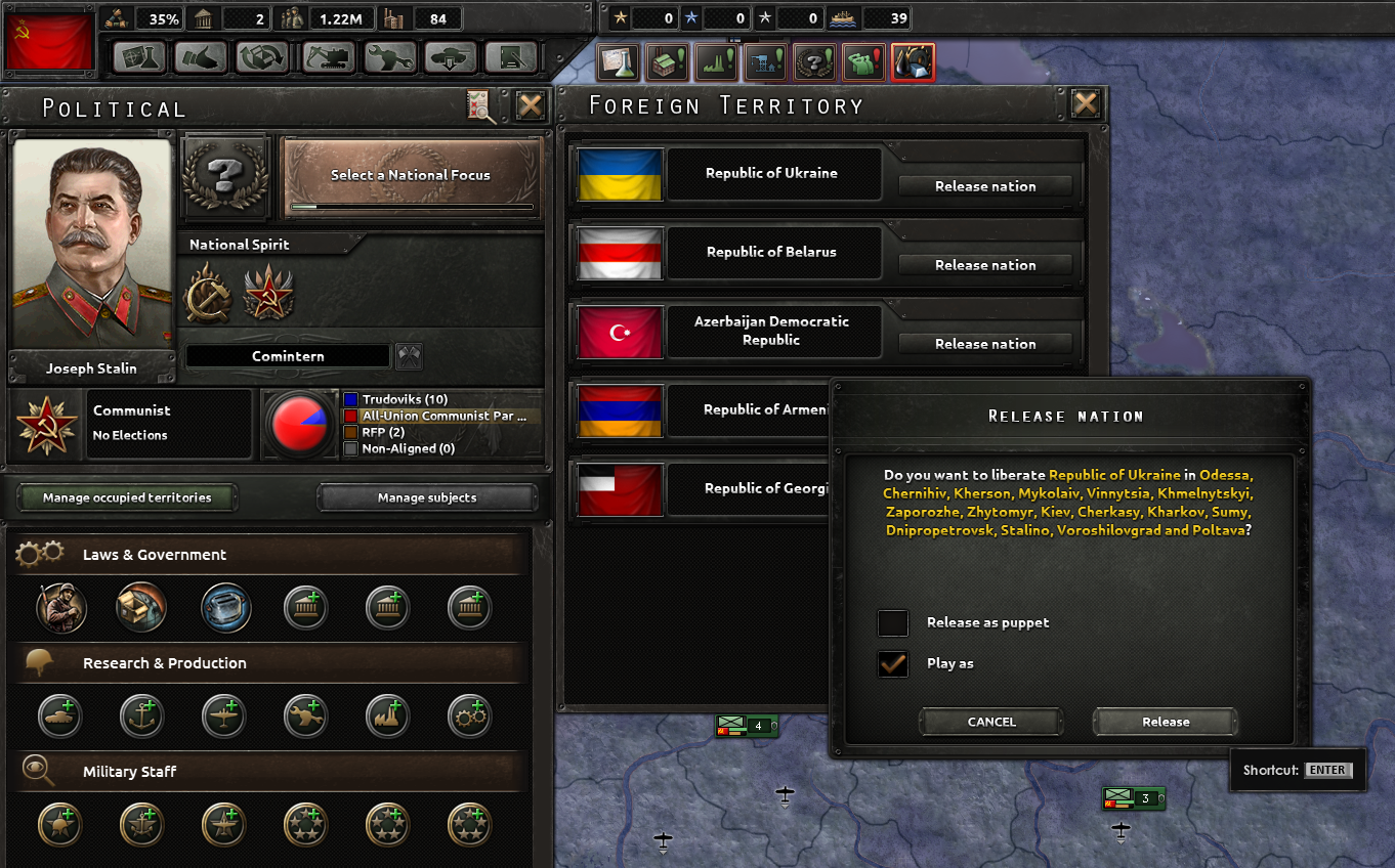 If released by the Soviet Union, Ukraine starts the game in 1936 as an authoritarian democratic state (no elections) with 70% national unity. It has a volunteer army, export trade focus, and civilian economy. The fascist party, led by Stepan Bandera, has 30% popularity, the ruling democratic party, led by Kost Levytsky, has 15%, the communist party, led by Nikita Sergeyevich Khrushchev, has 53% support, and the nonaligned party has zero support.