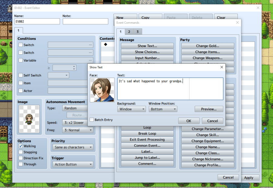 For the event image, choose someone from the “people” category. Then, under autonomous movement, choose “Random” from the drop down. You can change the speed if you want, but to keep things simple, leave everything else at its default setting. Finally, just like we created dialogue when Lucius read the letter, click “show text” and choose a facial image corresponding to the person you picked as the event image. Then enter a line of dialogue and click “OK”.
