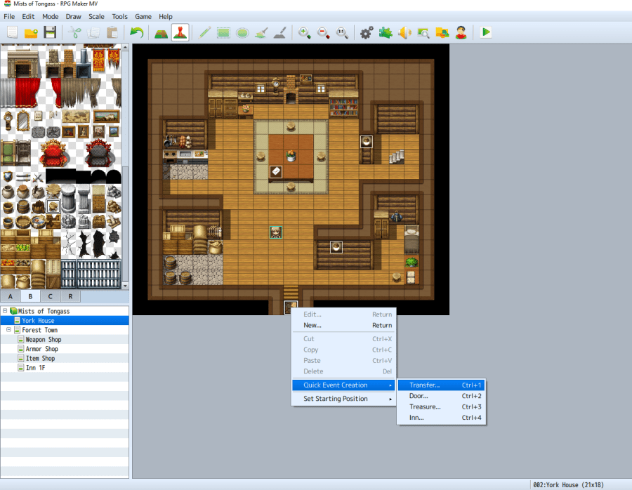 How does our hero get from inside a building to the town exterior and vice versa? RPG Maker MV has also made that simple for us. RPG Maker provides several common events used frequently in a game. In event editing mode, simply right click on the map and scroll down to “Quick Event Creation.” The two we are most concerned with here are “Transfer” and “Door.” While in the York House, right click on the center tile at the bottom of the map and insert a Transfer.