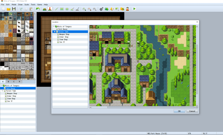 I don’t have time to create an entire town from scratch, but thankfully RPG Maker MV comes with several dozen premade locations. I chose “Forest Town” for the town exterior. Every building our hero will walk into needs an interior. Thankfully, there are premade interiors as well. You will need a Weapon Shop, Armor Shop, Item Shop, Inn, Tavern, and Jail interior at minimum. Oddly, there is no premade Tavern or Jail interior, but we’ll get to that later. There is also a magic shop on this map, but we won’t need that right now, so I will erase the bridge leading to that side of town.