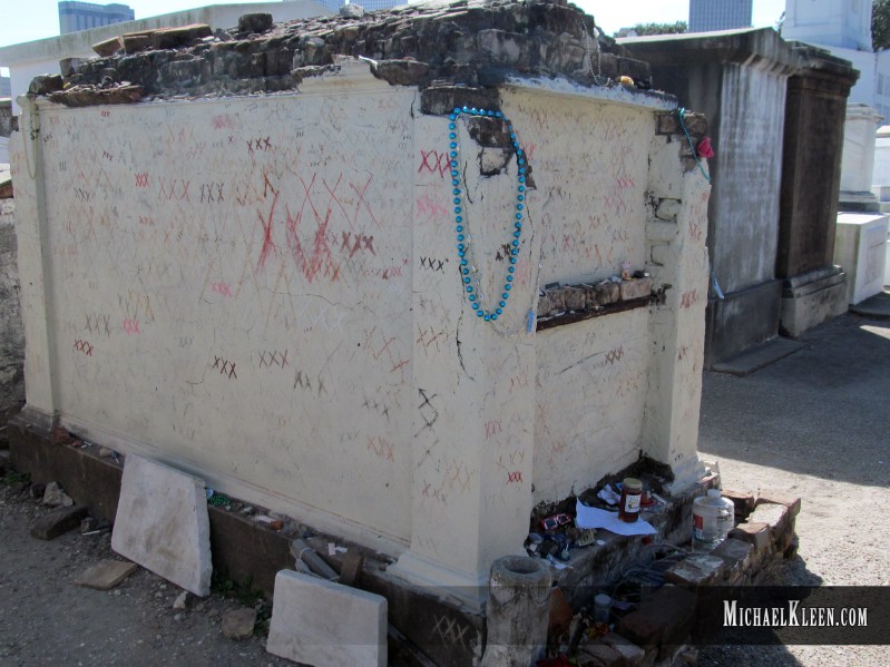 LaVeau was noted for the heavy infusion of Catholicism into her voodoo practice. Today, her crypt in Saint Louis Cemetery No. 1 has become something of a shrine. Visitors leave token offerings and draw Xs on her crypt, in the hopes that her spirit will fulfill their wishes.