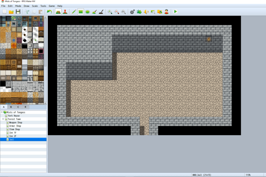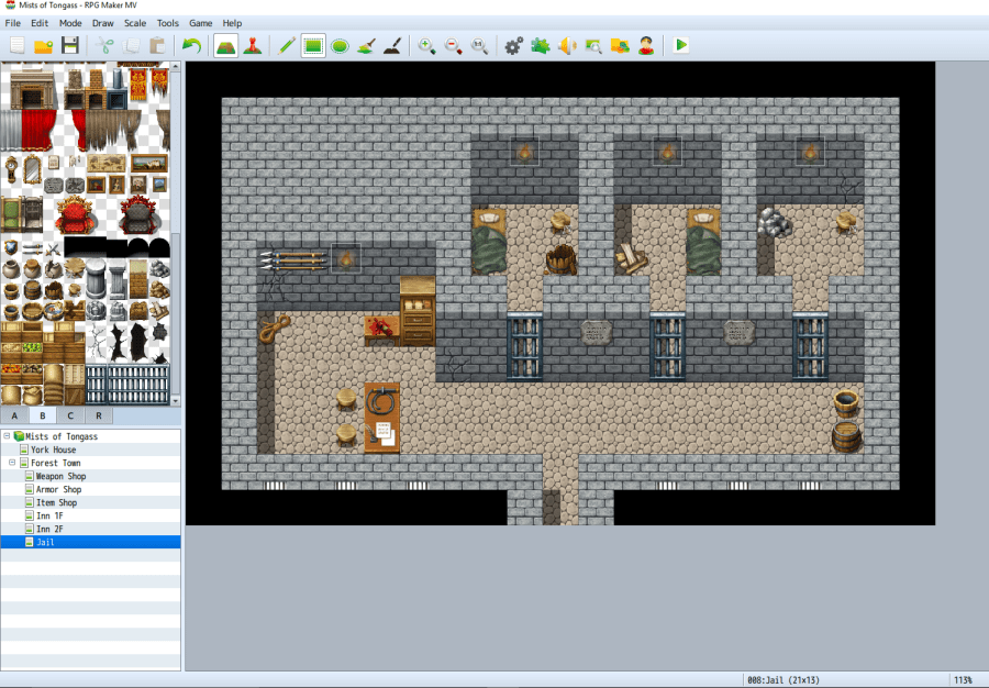 In Part III of our exploration of RPG Maker MV, we created a town for our game Mists of Tongass, added a few interactive townspeople, and learned how to enter and exit building interiors. Just to recap the game’s plot, our hero, Lucius York, discovered a letter from his grandpa explaining that he had been arrested for owing rent and sent to debtor’s prison. Today we will be designing the interior of that prison and setting up the main quest.