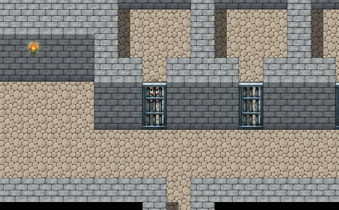 To add cell doors, switch to tileset layer “B” and scroll to the bottom. You’ll see a couple tiles that look exactly like a jail cell door. How convenient! They are two tiles high, just like our walls. There is a top tile and a bottom tile. Tiles are layered this way so that when the prisoner is in the jail cell, he or she can walk up to the door and appear to be standing behind it.
