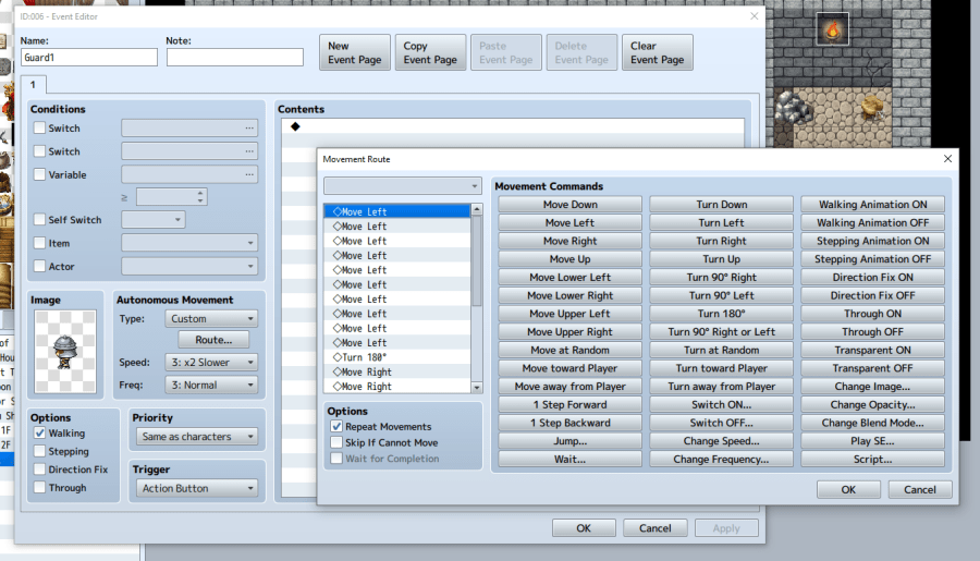 The Guard: I want the guard to patrol back and forth in front of the jail cells. How? Move the guard in front of the last cell door on the right, facing west. It is exactly ten tiles to the end of the hallway, so, double click on the guard to open the editing window. Then, under Autonomous Movement, change the type to “custom.” Under that, click the button that says “route.” Simply click “move left” ten times, then “turn 180 degrees,” then “move right” ten times, and then “turn 180 degrees.” Make sure the “Repeat Movements” box is checked. This ensures the guard will continue walking this path indefinitely.
