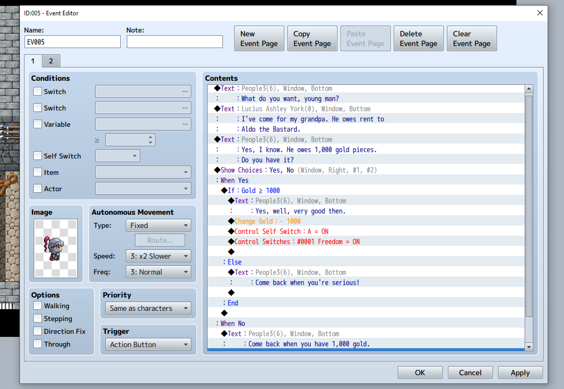 Now, under the condition “Else” select Show Text and enter something sarcastic (“Come back when you’re serious!”). That finishes the Yes branch. Under the condition When No, simply add a line of dialogue like, “Come back when you have 1,000 gold.” On the second event page, add a line of dialogue that says, “Your grandpa is free to go.”
