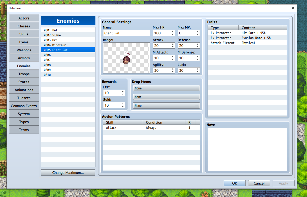 In slot 0006, create a new enemy called “Rat King.” This time, use the Rat image but slide the hue over to a dark purple (240). Increase its Max HP to 200, Attack and Defense to 30, and Agility and Luck to 40. Change the EXP and Gold to 25.
