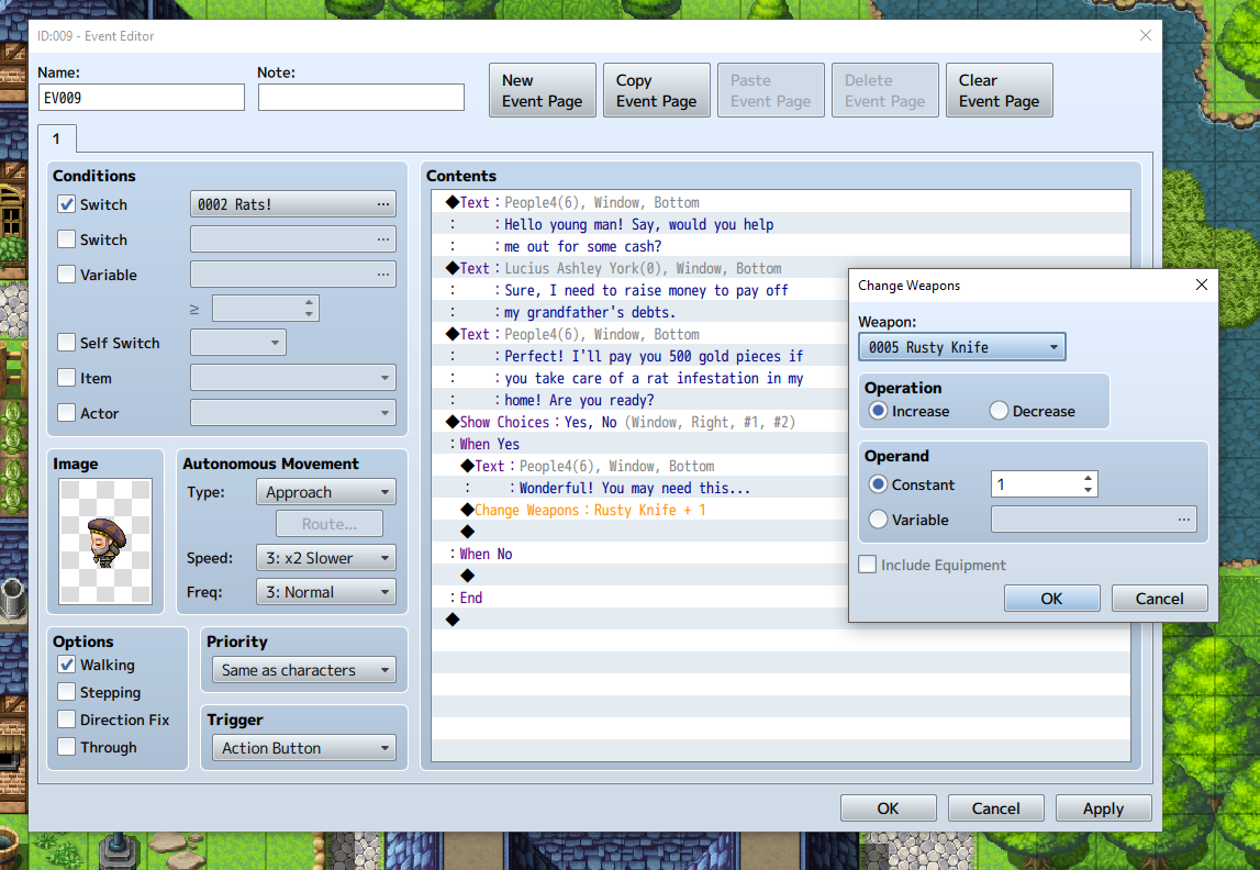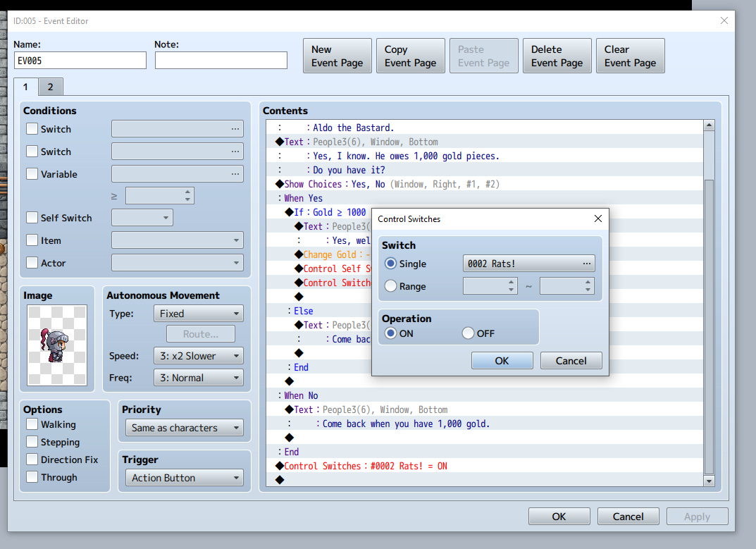 Now, return to the Forest Town map. Somewhere on the road outside the jail, create a new event and choose an image of a random villager–maybe the guy with the mushroom hat in People4. Under Conditions, check the box next to Switch and then select “0002 Rats!” from the dropdown. Under Autonomous Movement – Type, select “Approach” from the dropdown. You want to make this guy hard to avoid.