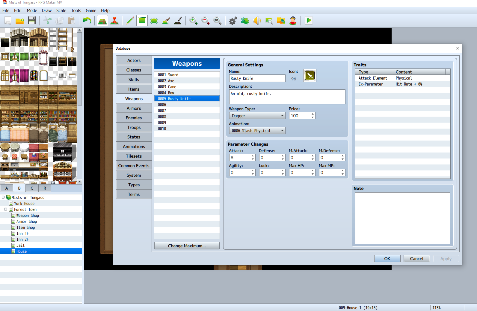 There are a couple things we need to set up before getting to the quest. First, we need to create two things: an item and a weapon. Load the Database Editor and click on the Weapons tab. Change maximum value to 10, then select blank slot 0005. Type in the name “Rusty Knife,” then select an appropriate icon. Click the dropdown under Weapon Type and select “Dagger.” Click the dropdown under Animation and select “0006 Slash Physical.” Change price to, say, 100, and Attack to 8. Then click Apply.