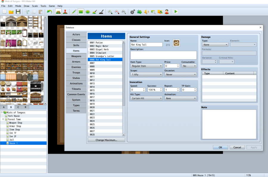 Open the Database Editor and click on the Enemies tab. Click on “0006 Rat King” and select the top slot under Drop Items. Select Item, then 0006 Rat King Tail from the dropdown. Click OK twice to close out of the Database Editor.