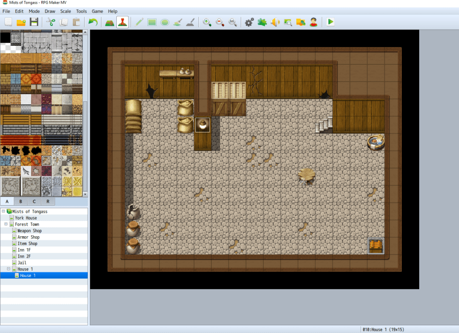 Now we need a location. Right click on the Forest Town map and load a pre-made house interior, say, House 1. Copy and paste that map to use as a template for the basement. Replace all the furniture and the floor in the the basement with stone tiles. Finally, add some random objects to the basement. Use CTRL+3 to create a quick treasure chest containing a healing potion. Notice how you can change its image–I chose a plain-looking crate.