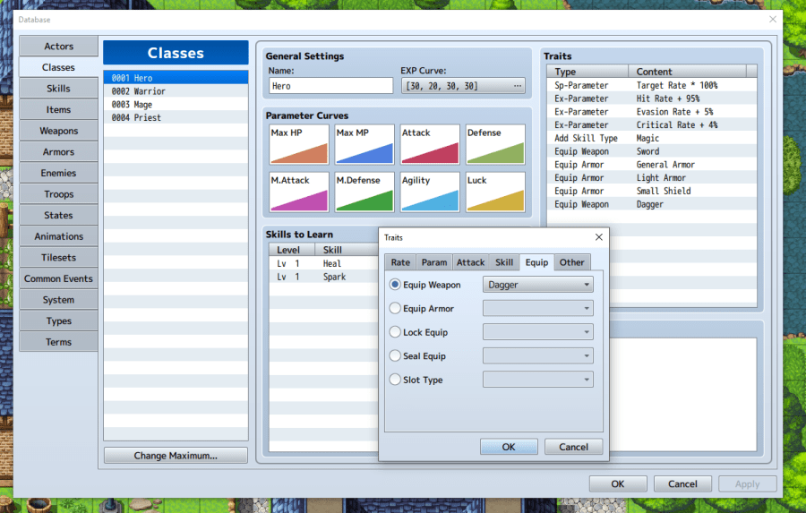 One more thing needs to be done. In order for Lucius to be able to equip and use the knife, a Trait needs to be added to his Class (Hero). Open the Database Editor and click on the Classes tab. In the Traits window, double click on an empty line, select Equip, Equip Weapon, and then pick Dagger from the dropdown.