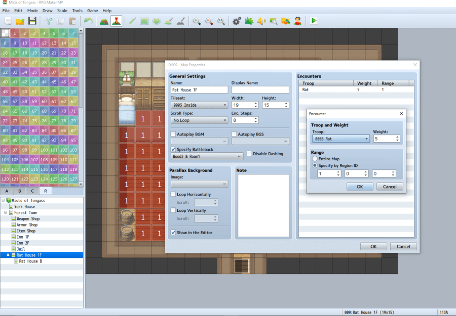 On the house’s main level, paint tile 1 (transparent red) over the entire floor. Then press the space bar to edit the map’s properties. Under Encounters, double click on a blank row and select “0005 Rat” from the drop down. Under Range, select “Specify by Region ID”, enter 1 in the first box, then click OK. Click OK again to return to the map editor. Now, every time Lucius steps on one of those squares, he has a chance of encountering a Giant Rat.