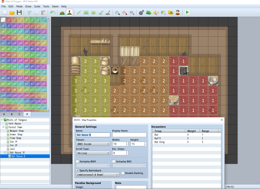 Divide the basement floor into three regions: 1 (red), 2 (orange), and 3 (yellow), with 3 being farthest from the stairs. This time, add three encounters: Rat, Rat*2, and Rat King. Assign Rat to region 1, Rat*2 to region 2, and Rat King to region 3. Finally, lower the Enc. Steps in Map Properties for both maps to 8. This is the average number of steps the player will take before encountering an enemy troop.