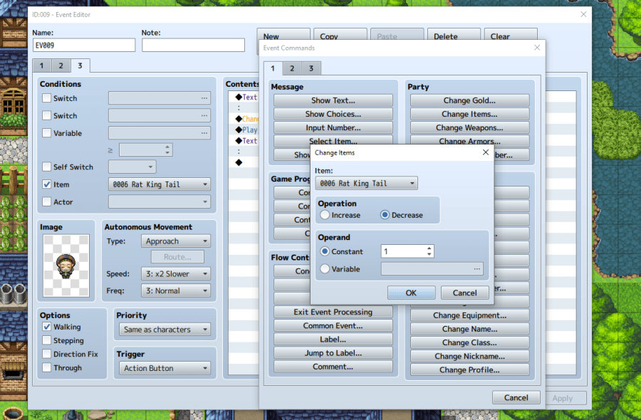 So Lucius goes to the house, enters the basement, kills a Rat King, and attains a Rat King Tail. He now has the item Rat King Tail in his inventory. Returning to the villager, he receives his reward. Create a new event page with the same image and movement behavior as the previous two. This time, under Conditions, select Item and 0006 Rate King Tail from the dropdown. In the Contents, insert a line of dialogue thanking the player for completing the mission. Then Change Gold… increase to 500. Insert generic text saying, “You have 500 gold pieces.”
