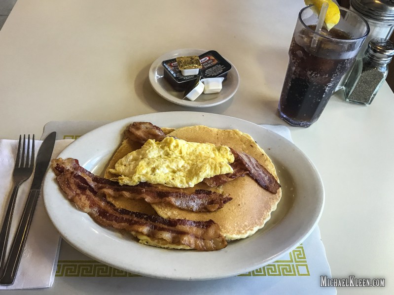 The usual diner crowd of old timers drinking coffee was there to greet me on my visit. I ordered the Big Boy Special–two pancakes with one egg and meat for $7.75. They must not have a lot of fat people in town if that’s considered the “big boy,” but it was enough to fill me up. My scrambled egg and bacon was piled on top the pancakes, but the bacon was delicious and the grease didn’t spoil my pancakes like at some other places.