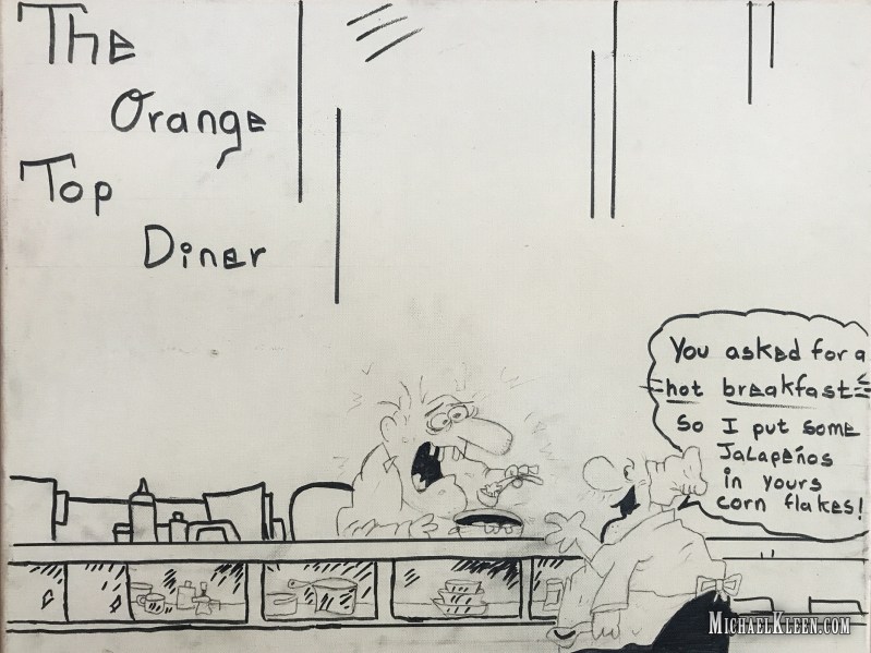 Along a lonesome highway in the middle of nowhere, in a town that’s seen better days, The Orange Top Diner is a real slice of Americana. It is a country-style diner with limited counter seating but plenty of booths and tables. Diner cartoons hang on the walls and a faded photograph of a family of raccoons rescued from a dumpster hangs over the register.