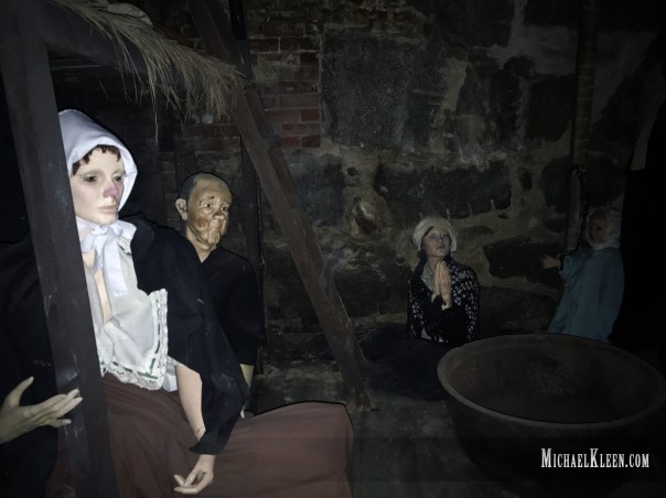 The dungeon itself contains small, cramped cells filled with wax figures in various states of pain and misery. At the very end, there is a larger display of a hanging tree–all meant to illustrate the torment the accused endured. The families of the accused had to pay for their room and board, and if they were too poor, the victims had to stand in what can only be described as a small closet.