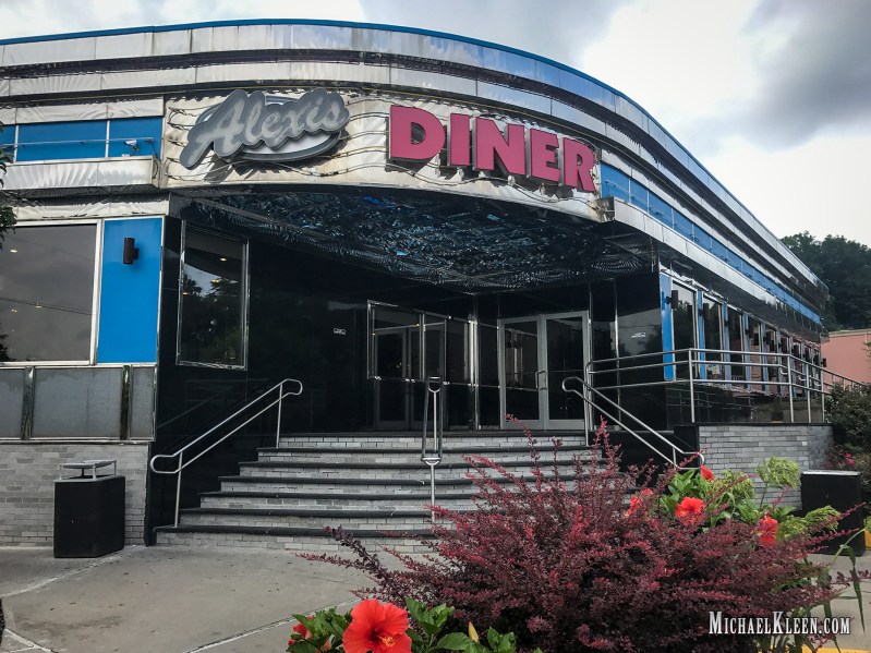 Located off I-84 at the juncture of Route 9W and N. Plank Road at the north end of economically depressed Newburgh, New York, Alexis Diner is a 24-hour Greek restaurant-diner hybrid with all the chrome you can ask for. Its extensive menu and desert offerings includes a full bar. There is limited counter seating but plenty of booths and tables. Wall murals and chandeliers hanging from the ceiling make for an unusually classy atmosphere.