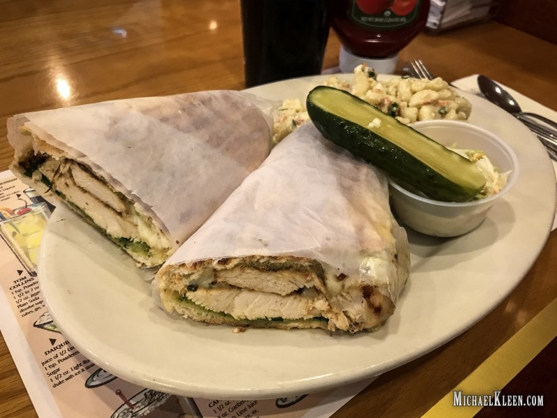 On my visit, I ordered the Mediterranean Panini with grilled chicken, fresh spinach, mozzarella cheese, and pesto for $10.75. It came with French fries, cole slaw, and half a pickle. I was able to substitute macaroni salad for the French fries for no extra charge. The waitress was attentive and the food was good.