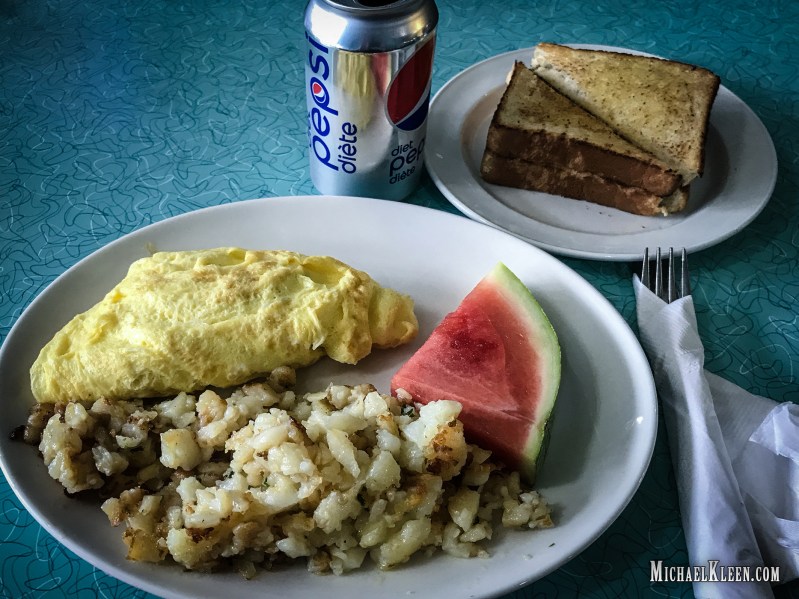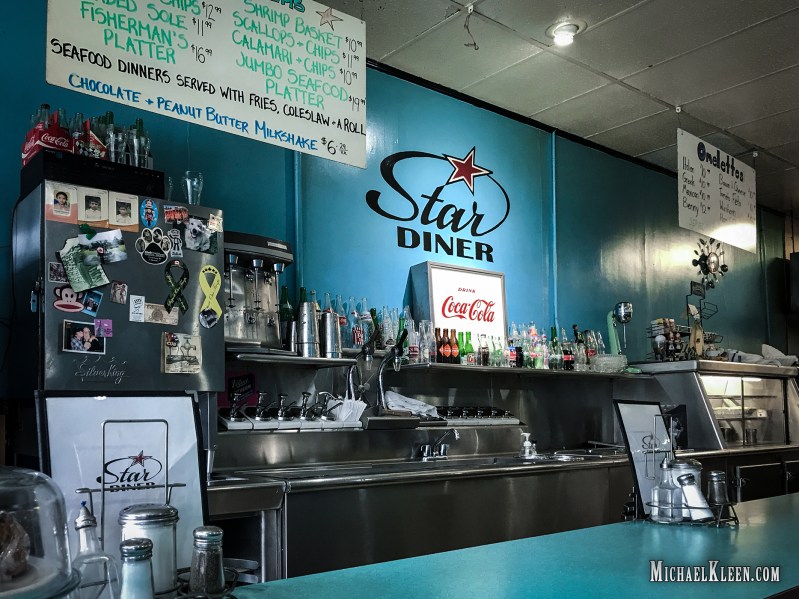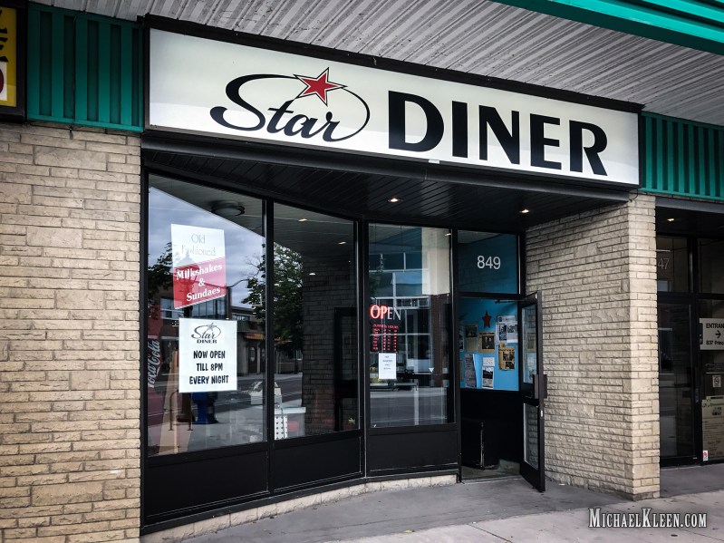 Photos from The Star Diner at 849 Princess Street in Kingston, Ontario. This storefront diner’s 1960s Atompunk aesthetic is groovy. I ate a crab omelet (on special), and it came with hash browns, toast, and a slice of watermelon. A hidden gem.