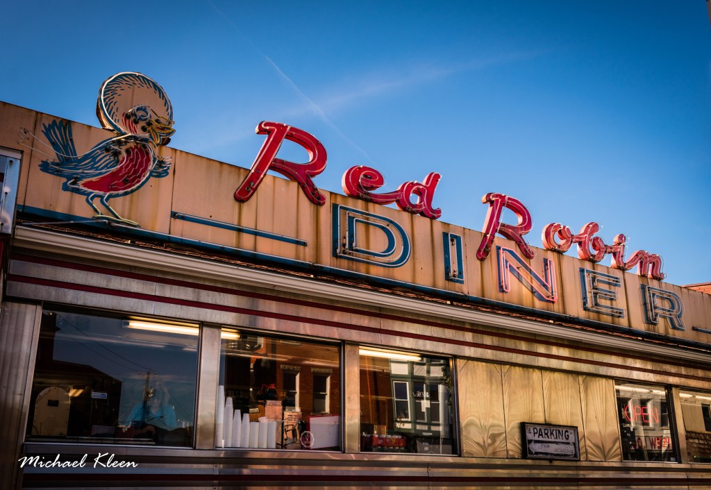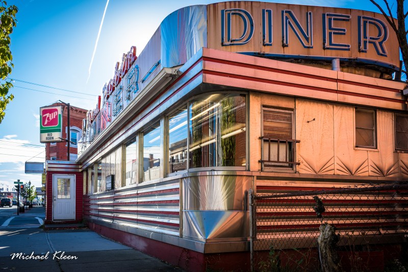 I first came across this old diner at the corner of Main and Broad streets in Johnson City, New York last winter. It was closed then, but looks like it’s reopened. The Red Robin Diner, at 268 Main Street, is a classic Mountain View-style diner that originally opened in neighboring Binghamton in 1950 and moved to its present location in 1959. The 35-ton diner took two hours to move. Chris and Pat Anagnostakos ran the business for 37 years until retirement. I love everything about this place, from the vintage 7-Up sign to the neon lights and chrome exterior.