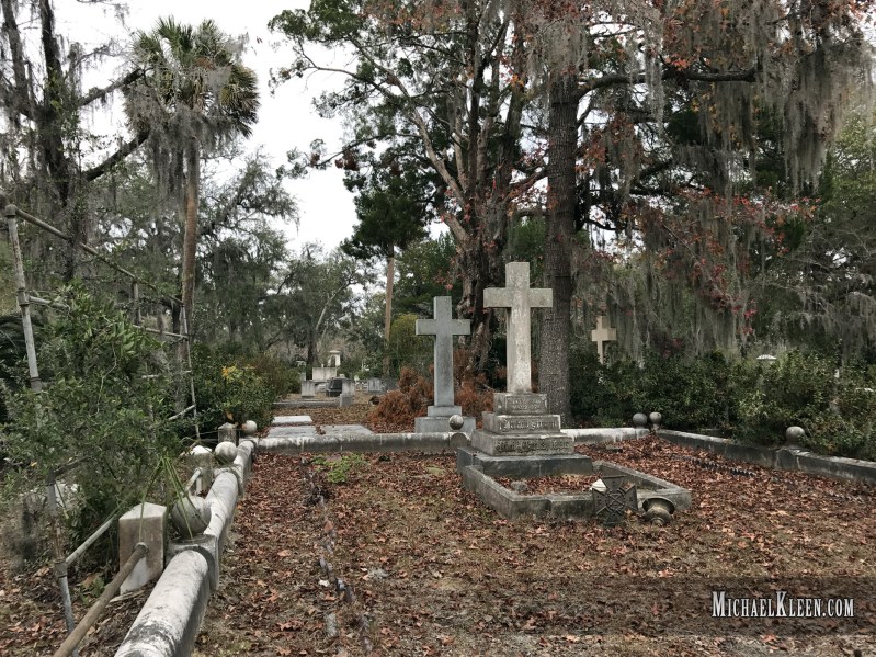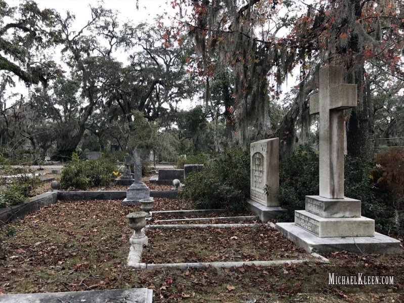 Live oak trees adorned with Spanish moss line the roadways of an old and neglected necropolis. Ferns engulf beautiful statues, while leaves and branches lay where they fell across stone-lined family plots.