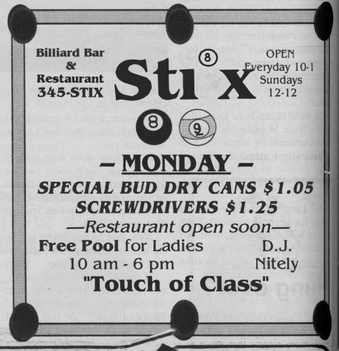Stix opened in early September 1990 and was originally a full restaurant and billiard hall, employing up to 60 people as waitresses, cooks, bartenders, disc jockeys, and doormen. It featured 15 Top Flyte pool tables and served breakfast, lunch, and dinner.