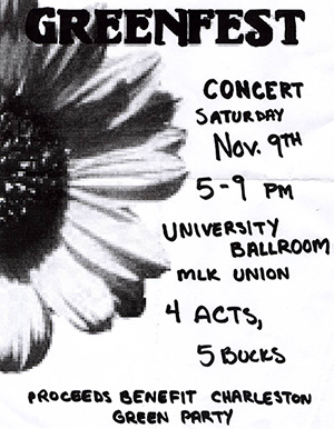 A year went by before that talk led to anything of substance. Elections are the lifeblood of politics, and the upcoming 2002 midterm elections energized campus activists. On Wed., March 6, 2002, the Student Senate approved the Charleston Green Party as a recognized student organization. The name was both ambitious and hopeful, since we didn’t have any actual Charleston residents in the group.