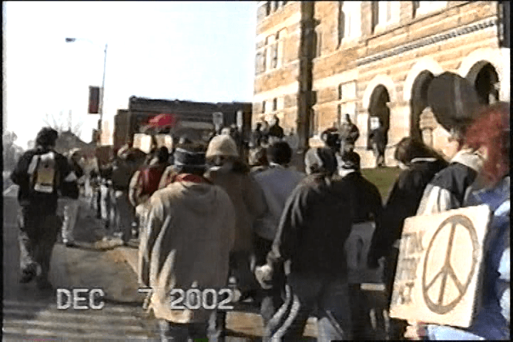 On the sixty-first anniversary of the Japanese attack on Pearl Harbor, December 7, 2002, a number of small campus groups, including the Green Party, junior art major Ryan McClure, and Newman Center director Roy Lanham, organized an antiwar protest to coincide with similar marches around the country. I showed up with my video camera to document the event and interview the participants.