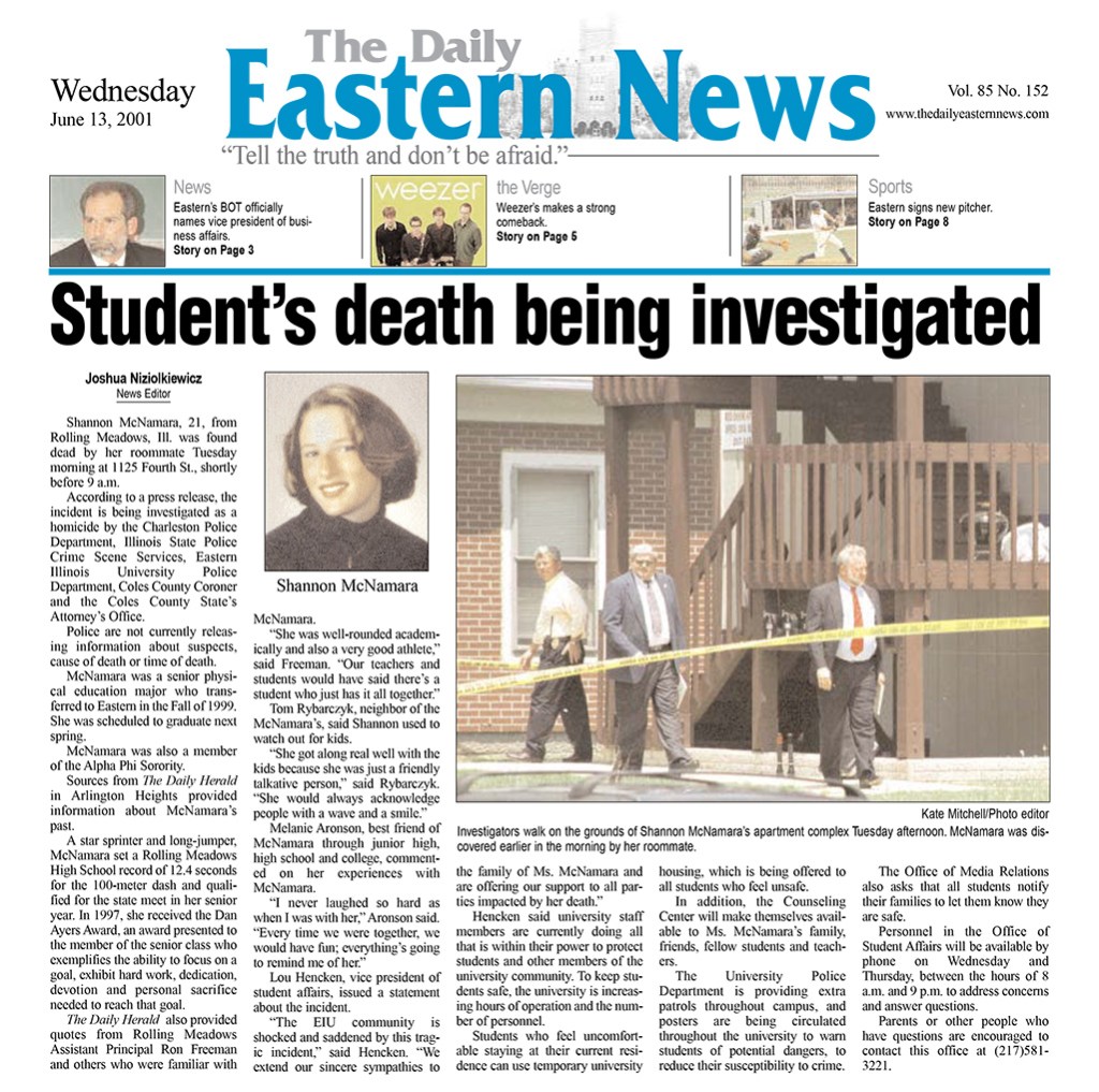 On the evening of Monday, June 11, 2001, Eastern Illinois University’s campus was deserted. The temperature was in the high 70s and falling. Most of EIU’s 10,531 students had returned home for the summer, but several hundred remained behind for summer classes, or to relax in the town they had come to love. I was back home in suburban Prospect Heights, relaxing after a long day working for the local park district. I would enter my sophomore year in August.