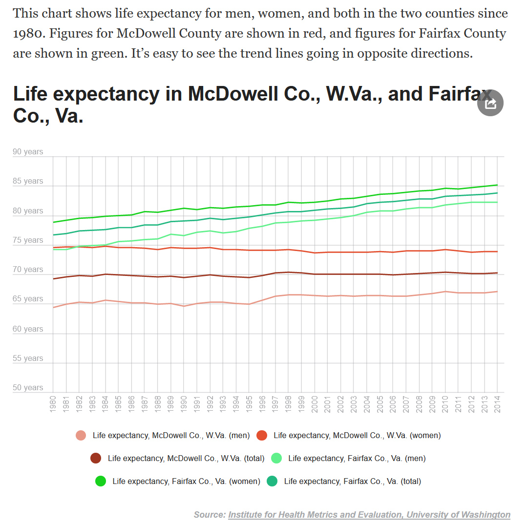 “In 2014, for example, in McDowell County, W.Va., one of the poorest counties in the nation, life expectancy for men was 64 years. In Fairfax County, Va., a wealthy county, just 350 miles away, life expectancy was nearly 82 years, an 18-year differential. The life expectancy gap for women in the two counties was 12 years.”
