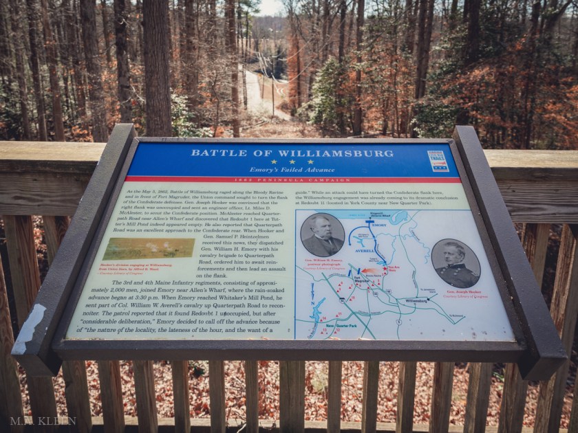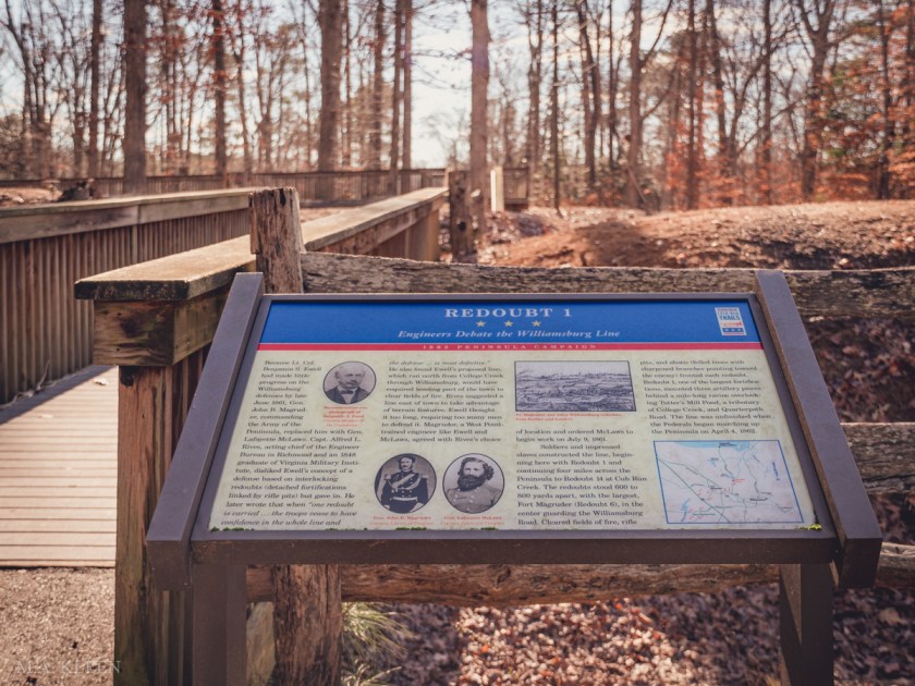 Redoubt Park was dedicated on May 5, 2007 to celebrate the 145th Anniversary of the Battle of Williamsburg. The Confederate earthworks sat in the woods for decades until Riverside Healthcare donated 21.5 acres of land during its development for use as a public park. I’m glad this historic site is open for visitors, as it is one of the best preserved Civil War-era earthworks I’ve ever seen.