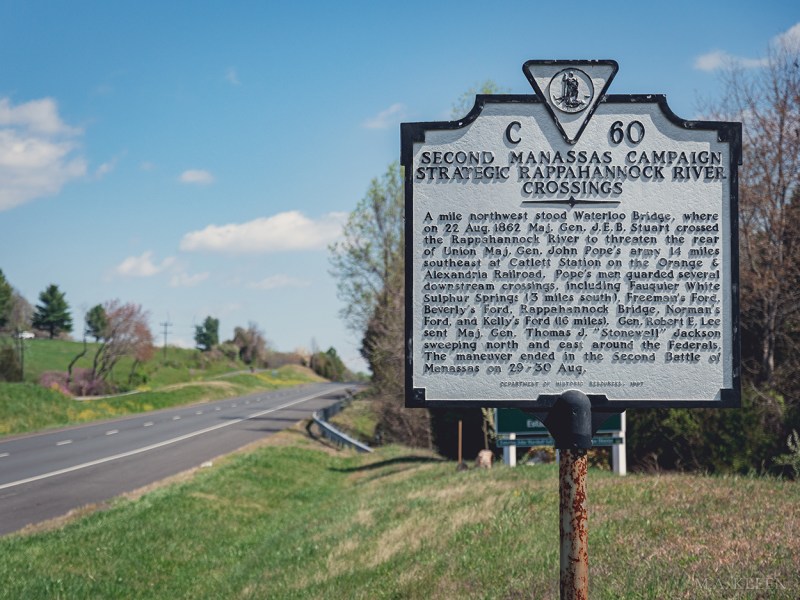 In July 1862, Maj. Gen. John Pope’s newly formed 51,000-man Union Army of Virginia began to consolidate across northern Virginia. After a bruising at the Battle of Cedar Mountain on August 9th, Pope withdrew his army behind the Rappahannock River, where he skirmished with Confederate Gen. Robert E. Lee’s 48,500-man Army of Northern Virginia and waited for reinforcements. Between August 22 and 25, the two armies fought minor skirmishes at Waterloo Bridge, White Sulphur Springs, Freeman’s Ford, and Beverly Ford.