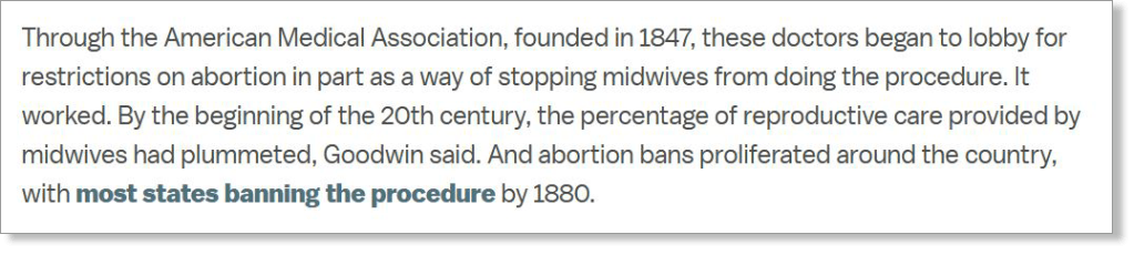 And then she moves on, with no further explanation for why doctors might want to advocate laws restricting abortion. This leaves the reader with the impression that the AMA advocated for restricting abortion in the United States simply because those dastardly white men (probably old too) wanted to take control over reproductive care away from women. The real reason, however, is because abortions performed by these midwives were often incredibly dangerous and involved methods like ingesting unregulated or untested poisons bought from the local apothecary.