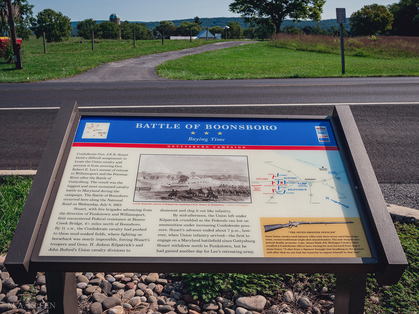 The Battle of Boonsboro was fought on July 8, 1863 between Union cavalry commanded by Brig. Gens. Hugh Judson Kilpatrick and John Buford and Confederate cavalry commanded by Maj. Gen. J.E.B. Stuart in Washington County, Maryland during the American Civil War. This inconclusive skirmish followed the Army of Northern Virginia’s retreat from Gettysburg and resulted in approximately 214 total casualties.
