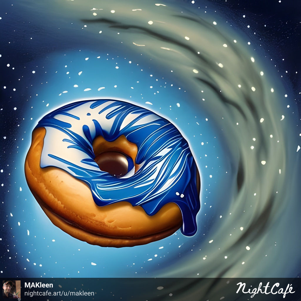 This A.I. creation made it into the top 5% in the NightCafe Studio Daily Challenge for Feb 12, 2023, with a theme of “donuts”. I had been playing around with images of things in space, particularly interstellar diners, when this challenge’s theme piqued my interest. I thought it might be cool to see a donut floating in space, and I guess a lot of other people agreed! Check out my other work on my profile.