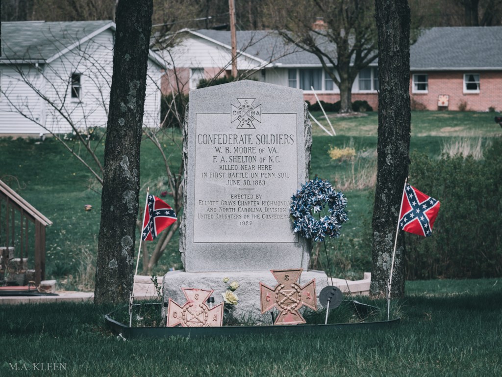 June 29, 1861 wasn’t the first time Confederates appeared in the small borough of McConnellsburg, nor was it the first skirmish, but it was the deadliest. A week earlier, men from George H. Steuart’s Brigade had skirmished with Pennsylvania militia and the 12th Pennsylvania Cavalry. Now it was Company G of the 18th Virginia Cavalry that appeared, looking for supplies. But Company A of the 1st New York “Lincoln” Cavalry was waiting for them. Without hesitation, the Confederates charged, but the Lincoln Cavalry turned the tables and counter-attacked, killing two of their foes and capturing 22. Despite acrimony toward the invaders, the local townspeople donated coffins and buried Sgt. William Moore and Pvt. Thomas Shelton along the Mercersburg Pike just east of town. A grave marker was erected in 1929, but it bears the incorrect date of June 30th.
