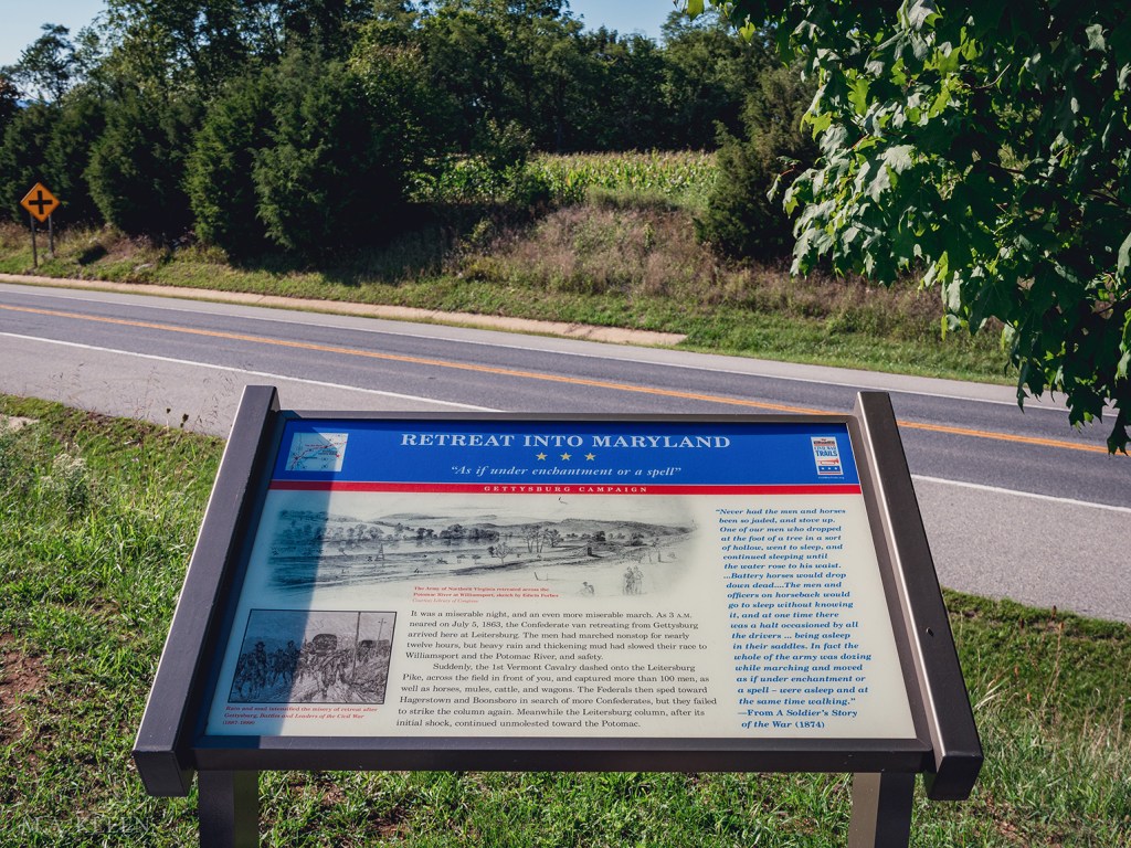 Adding insult to injury, the defeated Confederate Army of Northern Virginia was pounded by rain as it withdrew from Gettysburg. The weary men marched over twelve hours through the muddy mountain passes into Maryland. Around sunrise on July 5, 1863, the 1st Vermont Cavalry Regiment rode into Leitersburg, Maryland and saw the Confederate wagon train ambling through town. Its wagons overflowed with wounded soldiers. The Vermonters dashed into their midst, spoiling for a fight, but the Southern teamsters mostly gave up without a fight. They rode away with around 100 prisoners and destroyed as many wagons as they could before withdrawing.