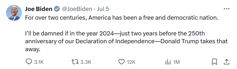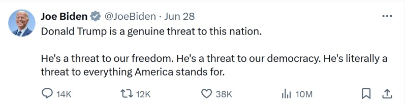 Thankfully, two hours after the event, President Joseph R. Biden held a brief press conference condemning the assassination attempt, saying “There’s no place for this kind of violence in America. We must unite as one nation to condemn it.” This is a relief, because just few weeks ago he (or someone on his social media team) tweeted “Donald Trump is a genuine threat to this nation. He’s a threat to our freedom. He’s a threat to our democracy. He’s literally a threat to everything America stands for.”