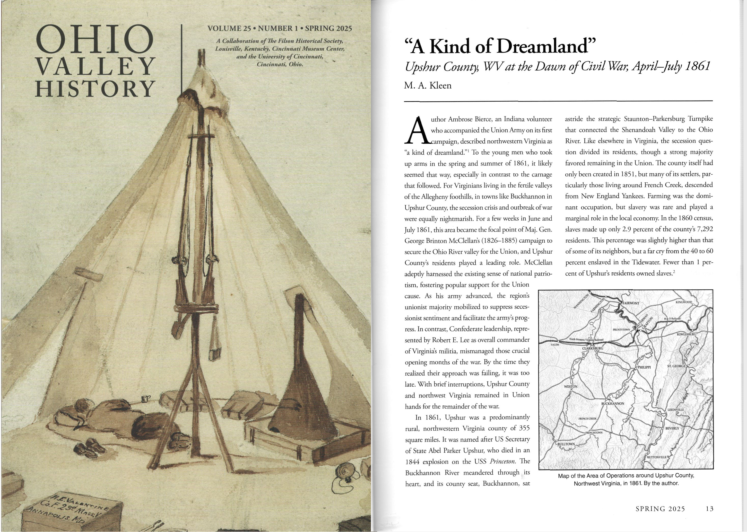 Appearing in the Spring 2025 issue of Ohio Valley History, “‘A Kind of Dreamland’: Upshur County, WV at the Dawn of Civil War” is my first academic article to emerge from my research at Spirit of ’61. Join me as I explore this interesting but often overlooked period of Civil War history.