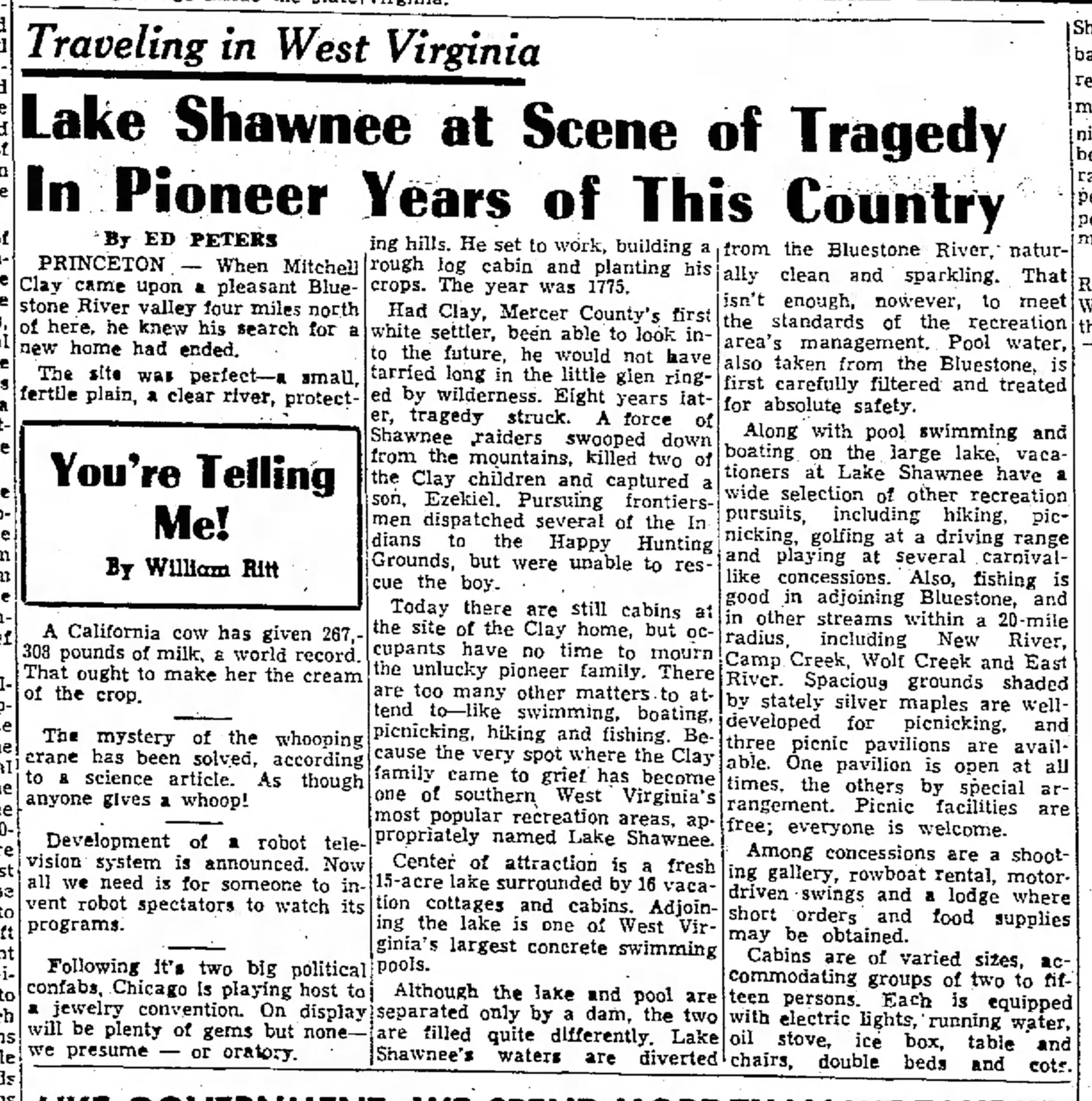 Peters, Ed. “Lake Shawnee at Scene of Tragedy in Pioneer Years of This Country,” The Raleigh Register (Beckley, West Virginia) 24 August 1952.