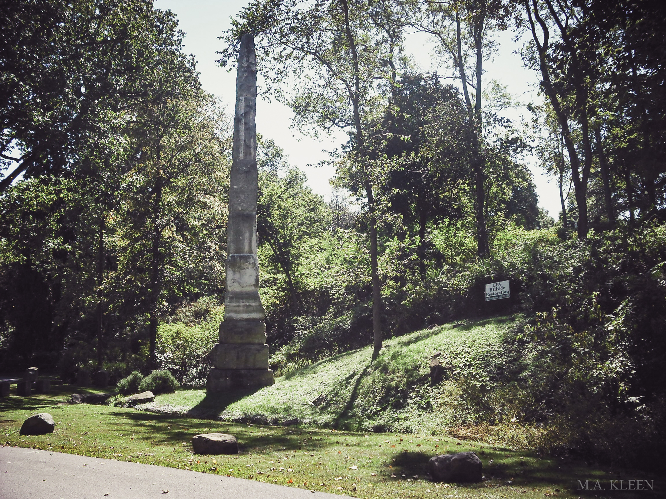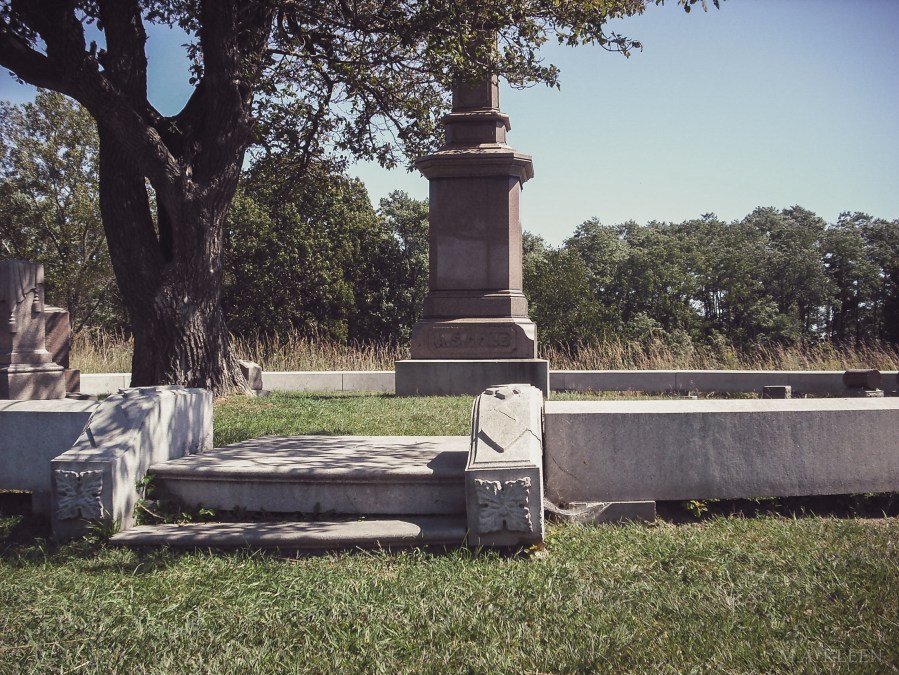 At the heart of this prairie lies the family plot of Peoria pioneer Almiran Smith Cole Sr., who emigrated from Massachusetts to Illinois in 1835. Cole opened Peoria’s first distillery, later selling it to establish a larger and more successful operation. His family plot, shared with his first wife, Chloe, along with their children and grandchildren, is encircled by a raised granite ring. Towering above the rest is a red obelisk marking the grave of Almiran Smith Cole Jr., standing beside a single, gnarled tree.