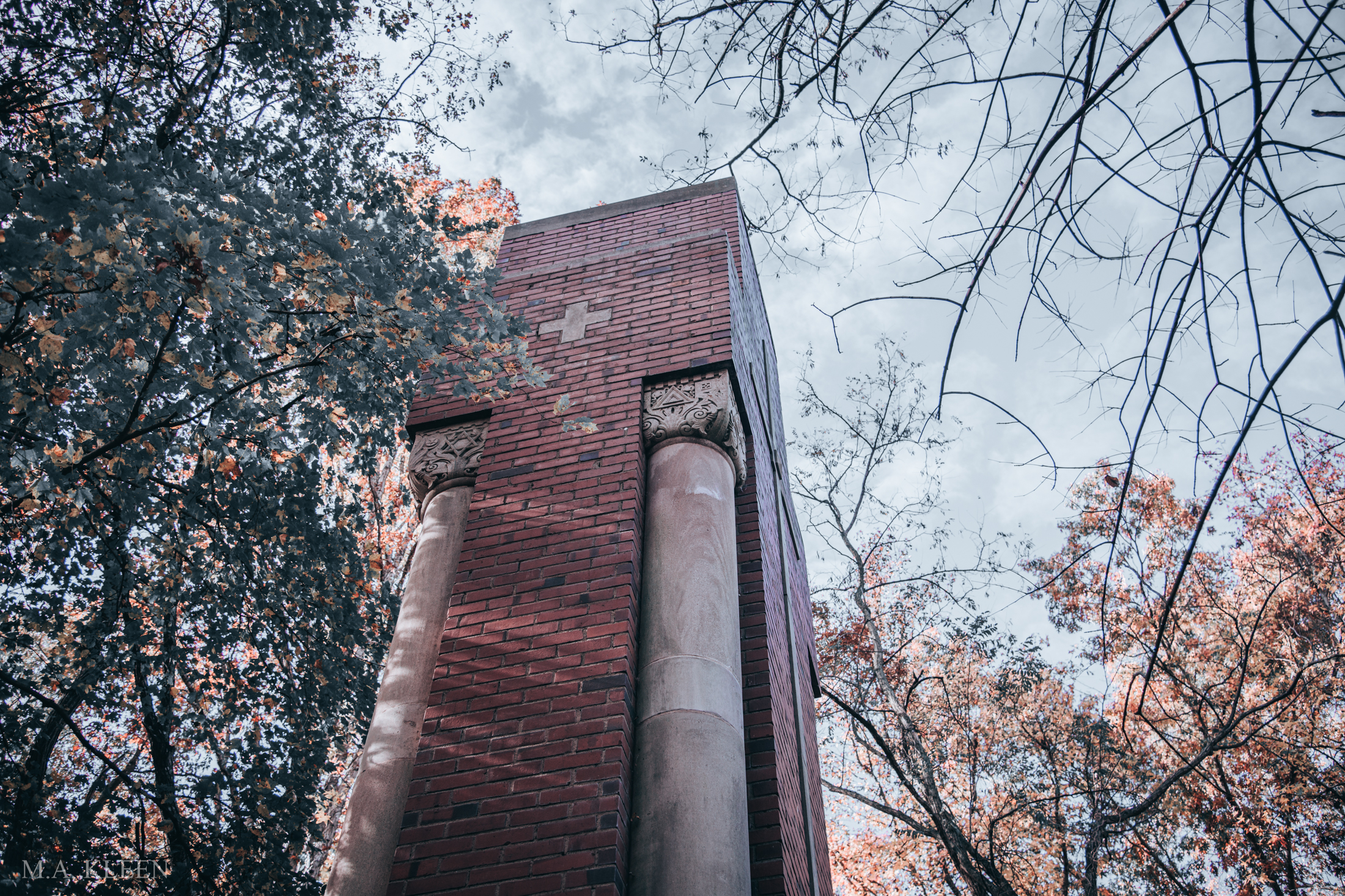 A tall, cross-shaped memorial in the woods near Pohick Church in Lorton, Fairfax County, is all that remains of an ambitious tomb conceived by architect Charles Mason Remey (1874-1974). Remey was an architect and early American follower of the Baháʼí Faith. In 1937, he contracted with Pohick Church in Lorton, Fairfax County, Virginia to lease land in their cemetery for a sprawling mausoleum complex. It was fitted with luxuries like chandeliers and marble reliefs. In the 1950s, however, vandals broke in and destroyed the interior. Pohick Church reclaimed the site in 1968 and took steps to secure it. Today, the site has been buried aside from this tall, cross-shaped memorial. Remey died in 1974 and is buried in Italy.