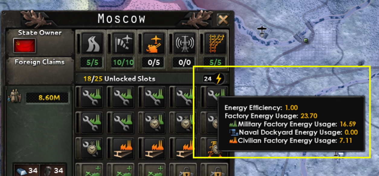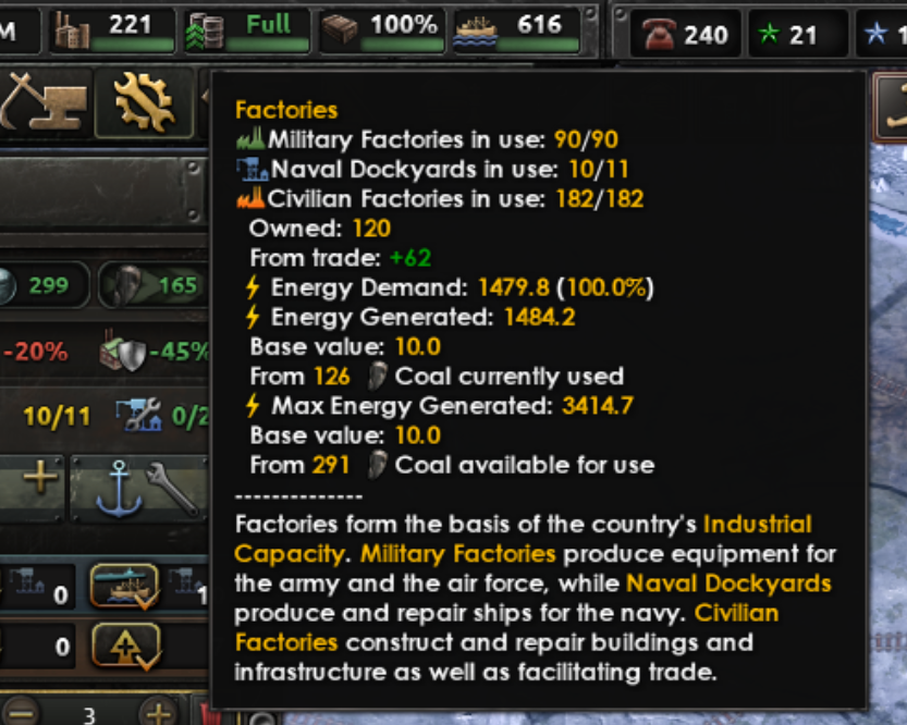 The purpose of this new resource is to restrain the number of factories a country can build. Each factory (civilian, military, and dockyard) now costs energy, which is produced by coal. If your number of factories outstrips your coal output, production penalties are imposed. Push back from the gaming community compelled Paradox to introduce new features, which are explained below.