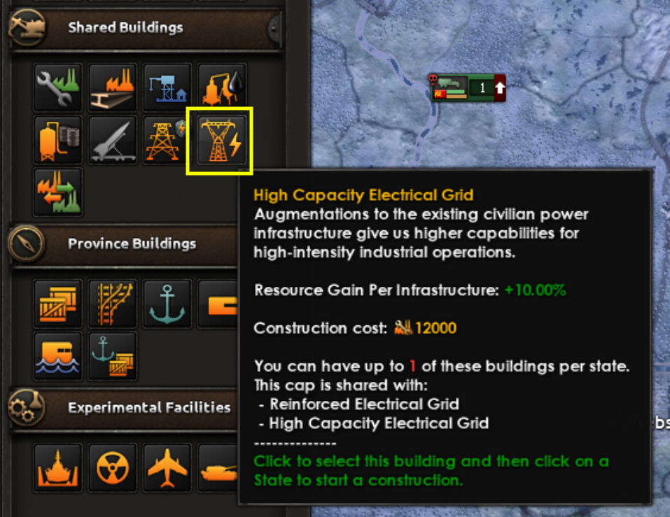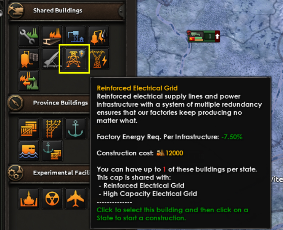 Obviously you will want to build the Reinforced Electrical Grid in provinces with a high number of factories and the High Capacity Electrical Grid in provinces with a high amount of resources, preferably coal.