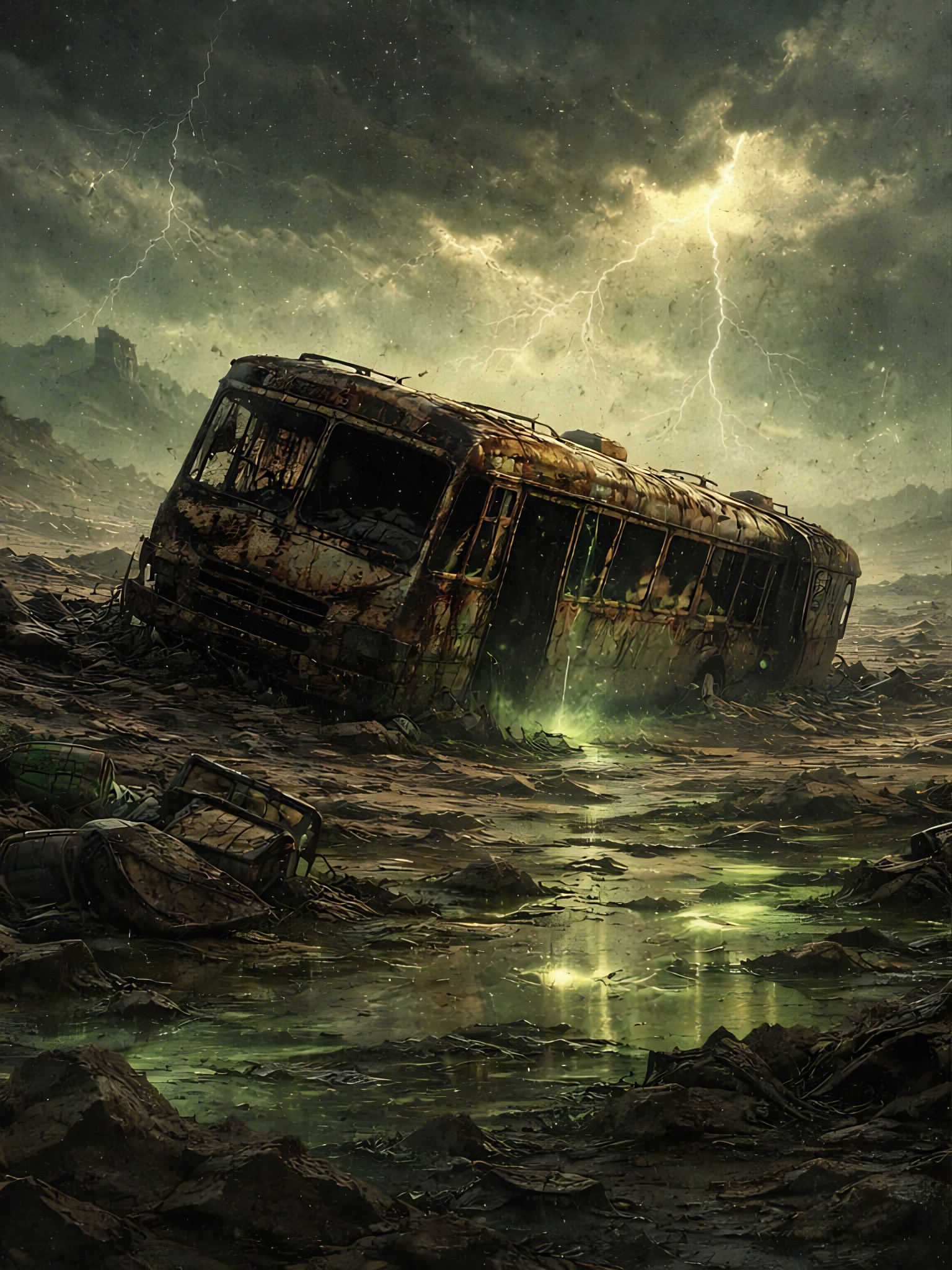 Outside, lightning cracked again, and for a moment the ash glowed green. The bus rattled like it wanted to come apart.