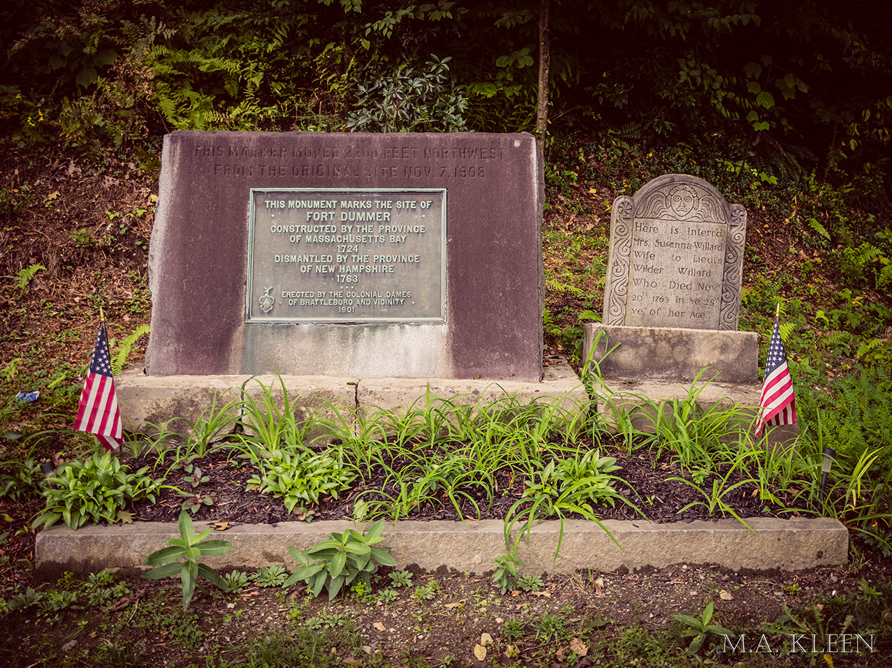 A small monument erected in 1901 marked the site of Fort Dummer, but it was moved seven years later when the Vernon Dam was built on the Connecticut River, which flooded the area. It is now located near a dirt pull off at the intersection of Vernon Street and Cotton Mill Hill. A granite headstone for Susanna Willard, wife of Lt. Wilder Willard, who died in 1763 at the age of 28, is also there.